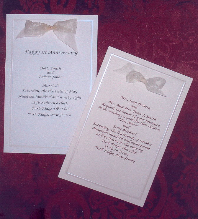 If you do not have an original invitation and want Mount Eve Keepsakes to print an invitation for you on our elegant white or cream with coordinating satin border, please fill out the information below. |