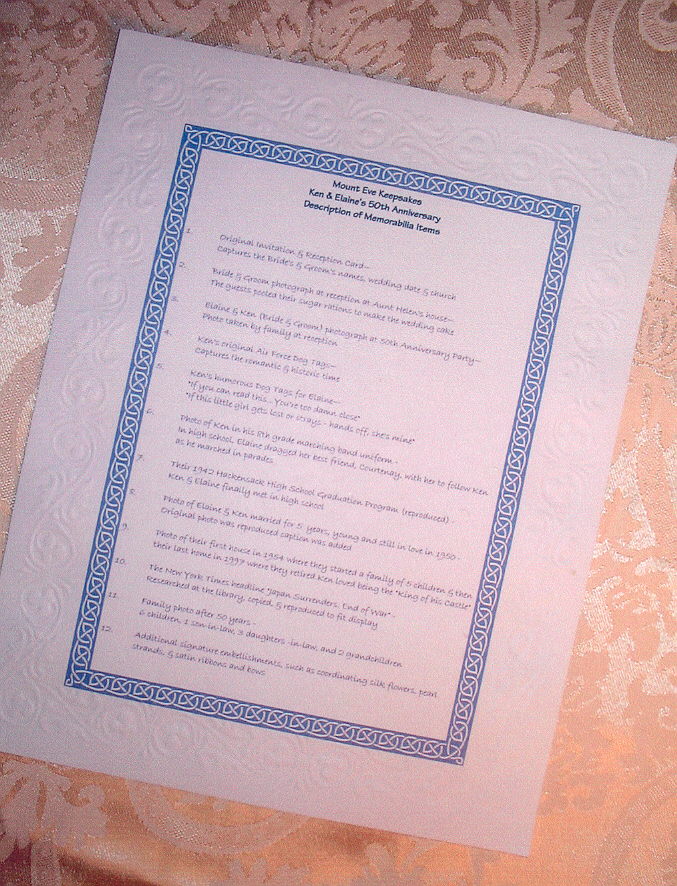 8.5"W x 11L" Printed List of Memorabilia Significance on elegant white embossed heavyweight paper. Please include detail of the memorabilia's origin and significance via email to karen@mountevekeepsakes.com. |
