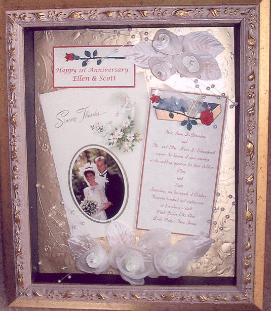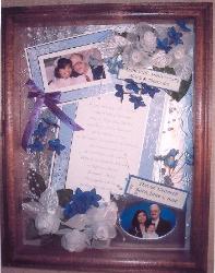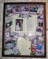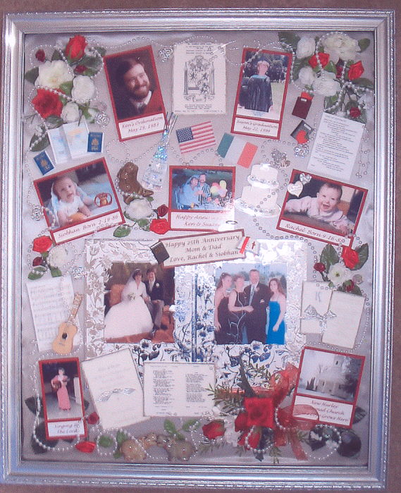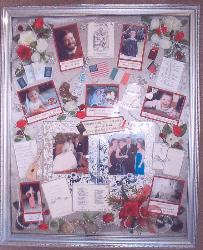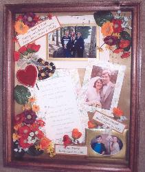Items to be included,although certainly not limited to: 1. Invitation, Reception & Thank You Cards 2. Bridal Couple and/or Wedding Party Photos 3. Family photographs - Spouses, Children, grandchildren, friends, vacations, and events. 4. Silk Flowers from Bridal Bouquets & Hair Wreaths and/or combs. If you don't have the actual flowers, take note of the individual types of flowers & flower colors and I can reproduce the bouquets in miniature version. A picture says it best. 5. Family documents such as the Certificate of Marriage or love letters- can be reproduced & scaled down to fit the display. 6. Jot down a list of memorable moments or activities that took place that made the wedding day and their life together unique & special such as honeymoon memorabilia, the birth dates and names of children, romantic vacations taken, adventures embarked on, wedding & favorite songs, anything. |