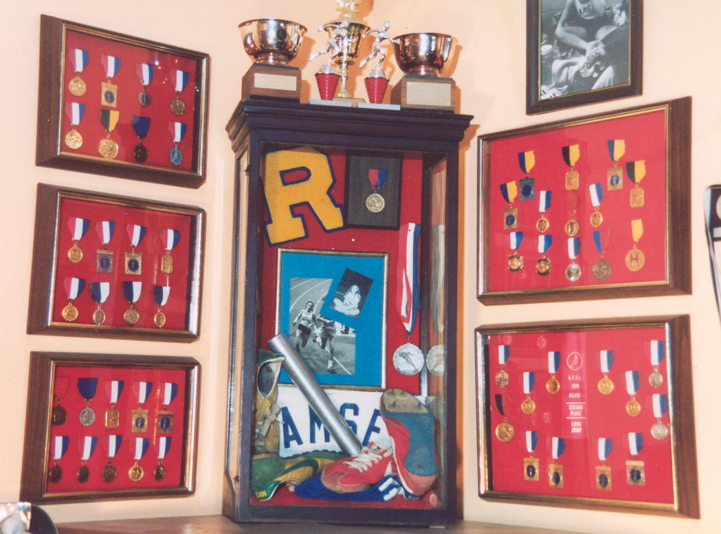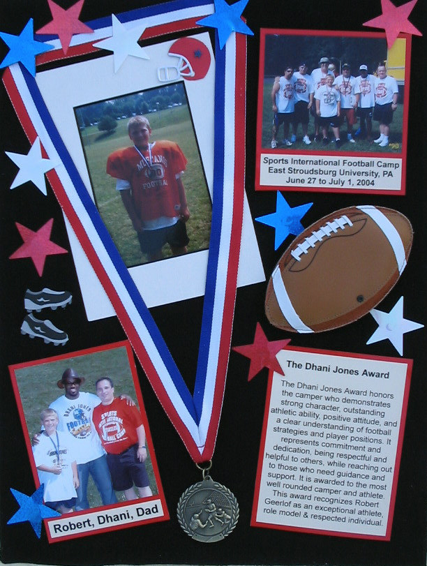 The custom Football Award display above highlights Robert's summer football camp outstanding achievement of earning the Dhani Jones Award. The Dhani Jones award honors the camper who demonstrates strong character, outstanding athletic ability, positive attitude, and a clear understanding of football starategies and player positions. A photo with Dhani Jones, Robert and his father accompanying a writeup of the award preserve this accomplishment. |