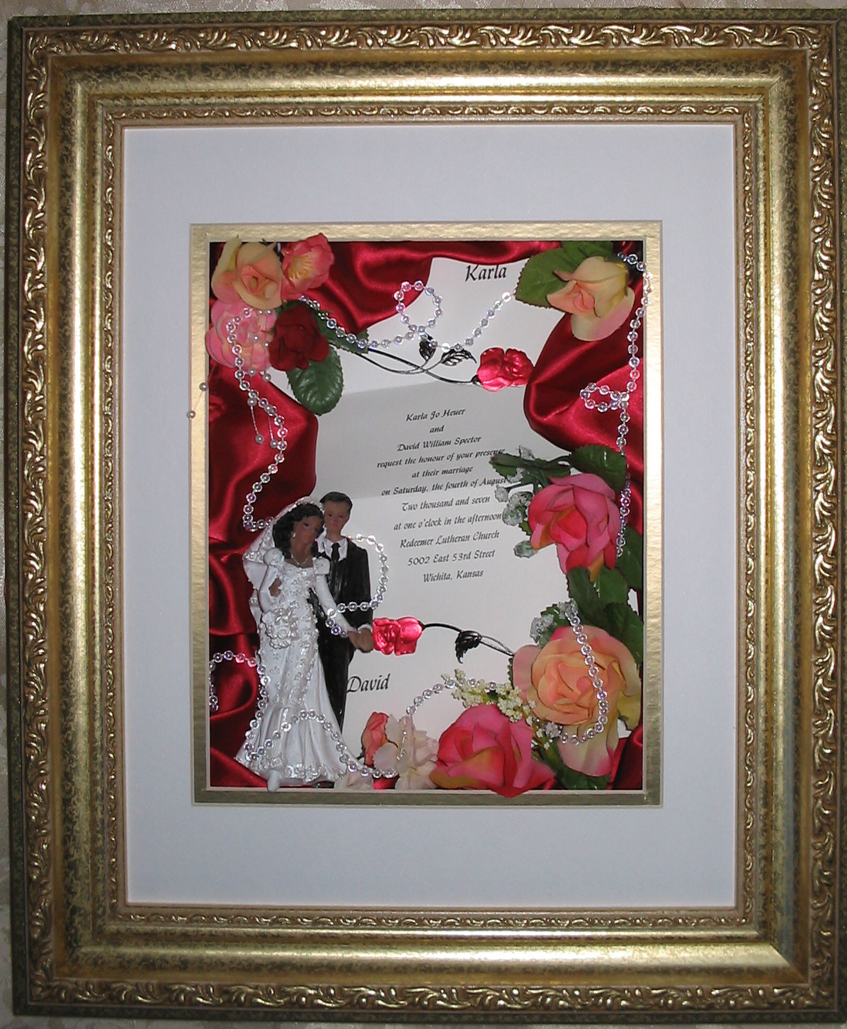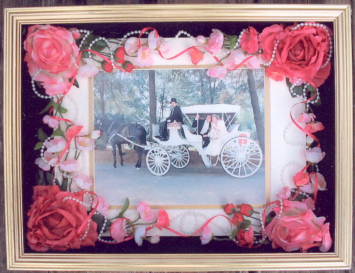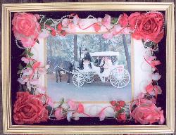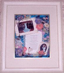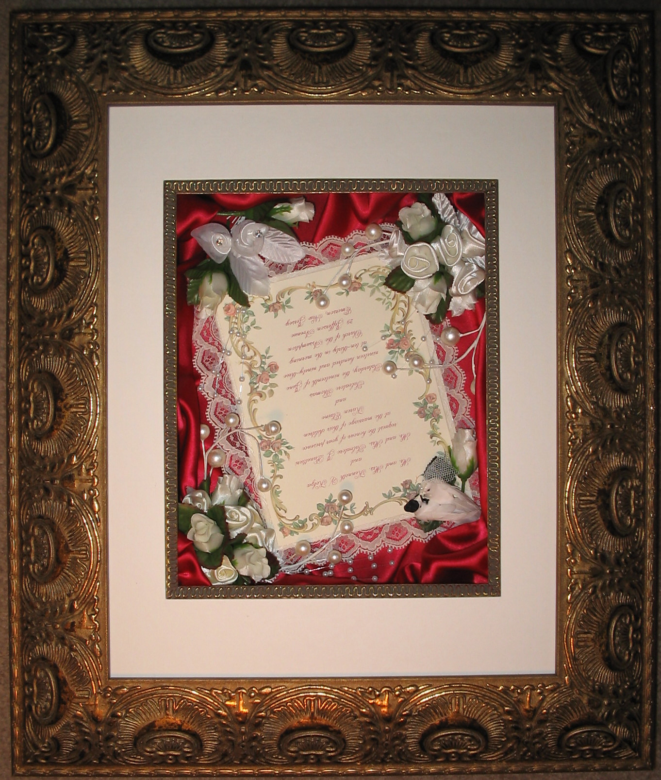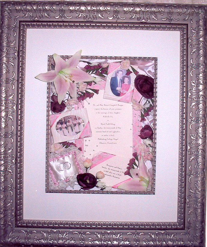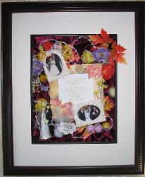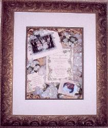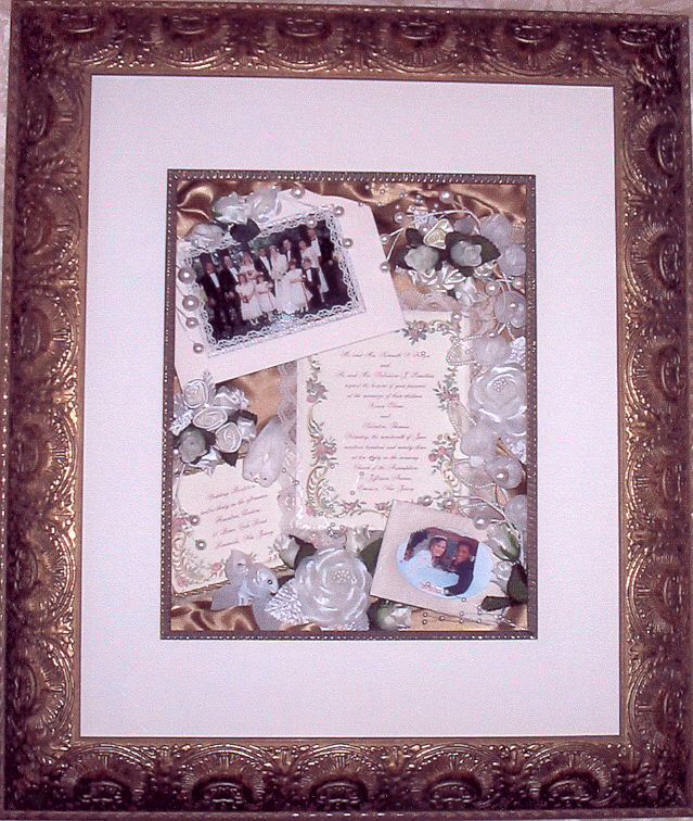 We offer two sizes of matted Memorabilia Keepsake Displays designed for those romantic brides and mementos such as the Wedding Invitation & Reception Card, a Photograph or two and / or Wedding Favors. Our 16" x 20" elegant matted frame selection surrounds an 11"x14" custom Memorabilia Keepsake Display. This size comfortably accommodates the Invitation and Reception Card and two wallet size Photos. Depending on the sizes of the invitation and reception card, we may be able to accomodate one 3.5" x 5" photo in place of one of the wallet size photos. There usually is room for a Wedding Favor or two such as Blowing Bubble Bottles, Match Books, and / or small Bride & Groom Cake Topper. Our 11" x 14" elegant matted frame selection surrounds an 8" x 10" custom Memorabilia Keepsake Display. This size highlights the Invitation. Depending on the size of the invitation, there usually is room for a Wedding Favor or two such as Blowing Bubble Bottles, Match Books, or Small Bride & Groom Cake Topper. We start with what you provide us with. The more, the better. Let us work with as much as possible. We then embellish your memorabilia with shimmering pearl strands, silk ribbons & bows. All unused memorabilia will be returned with the finished display. On the order form, tell us the flower types and colors used in the bridal party (providing a picture is best) and we will reproduce them with silk flowers to accent the invitation. |