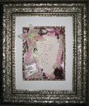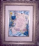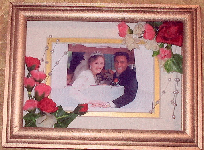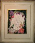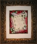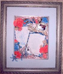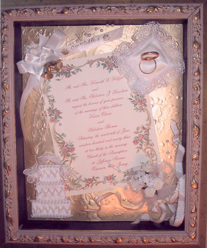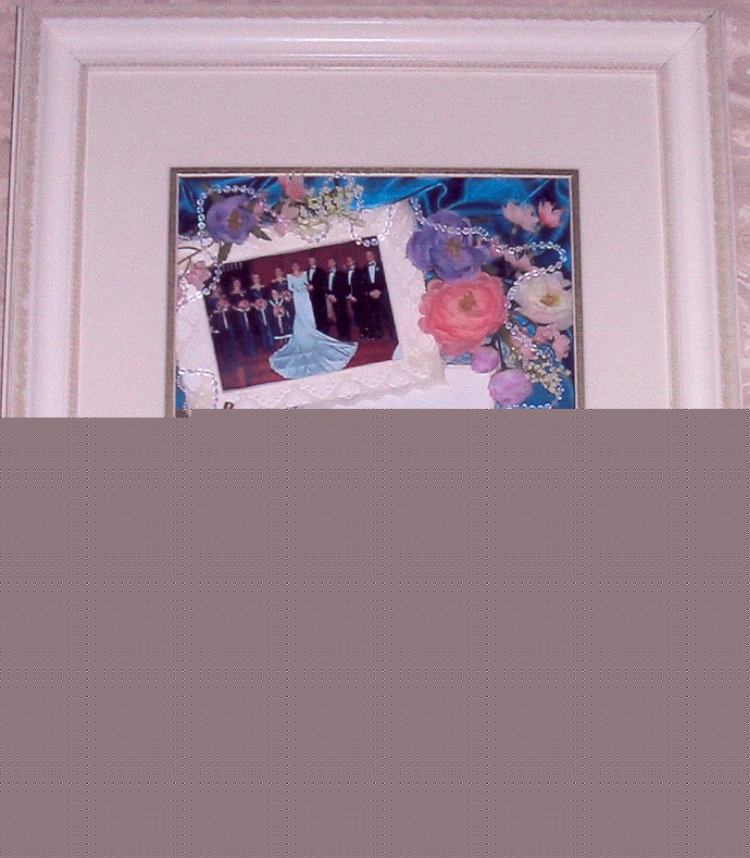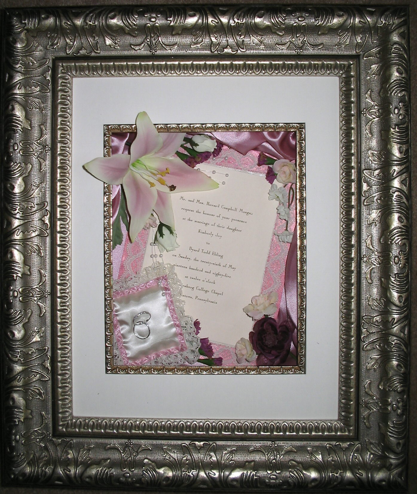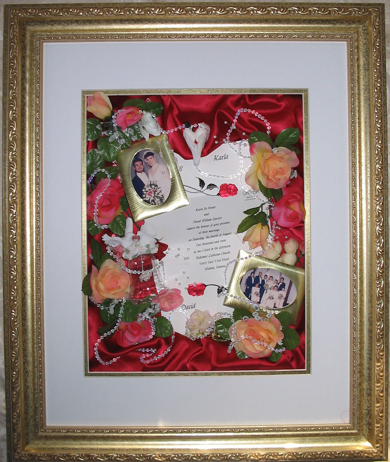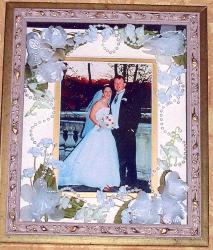 We offer two sizes of matted Memorabilia Keepsake Displays designed for those romantic brides and mementos such as the Wedding Invitation & Reception Card, a Photograph or two and / or Wedding Favors. Our 16" x 20" elegant matted frame selection surrounds an 11"x14" custom Memorabilia Keepsake Display. This size comfortably accommodates the Invitation and Reception Card and two wallet size Photos. Depending on the sizes of the invitation and reception card, we may be able to accomodate one 3.5" x 5" photo in place of one of the wallet size photos. There usually is room for a Wedding Favor or two such as Blowing Bubble Bottles, Match Books, and / or small Bride & Groom Cake Topper. Our 11" x 14" elegant matted frame selection surrounds an 8" x 10" custom Memorabilia Keepsake Display. This size highlights the Invitation. Depending on the size of the invitation, there usually is room for a Wedding Favor or two such as Blowing Bubble Bottles, Match Books, or Small Bride & Groom Cake Topper. We start with what you provide us with. The more, the better. Let us work with as much as possible. We then embellish your memorabilia with shimmering pearl strands, silk ribbons & bows. All unused memorabilia will be returned with the finished display. On the order form, tell us the flower types and colors used in the bridal party (providing a picture is best) and we will reproduce them with silk flowers to accent the invitation. |
