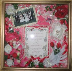 Items to be included, although certainly not limited to might be: Invitation, Reception & Thank You Cards, Bridal Couple and/or Wedding Party Photos, Wedding Party Favors such as Blowing Bubble Bottles & Church Rice Containers, Matchbook Covers, Cocktail Napkins and/or Candy Wrappers with the bridal couple's names and marriage date Silk Flowers from Bridal Bouquets, Hair Wreaths and/or combs (If you colors and we can reproduce the bouquets in miniature version), Bride's and Bridesmaids' Dress Scraps left over from the dress fittings (fabric scraps can be made into small roses & other decorations), Jot down a list of memorable moments or activities that took place that made that day unique & special such as the colors of the bridal party's dresses & tuxedos, the wedding song, honeymoon destination, or season of the year. Let Mount Eve Keepsakes do the rest ! |